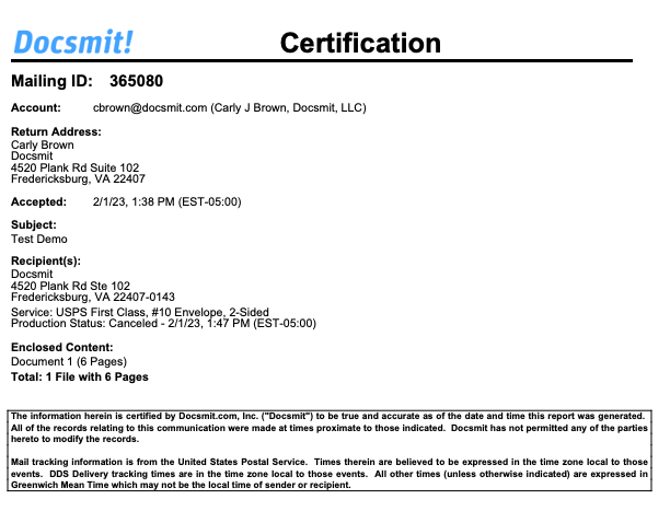 We issue Certification of Mailing for every article of mail that we send. This is an attestation that we have mailed the document, who we mailed it to, and a description of the document. See sample below.